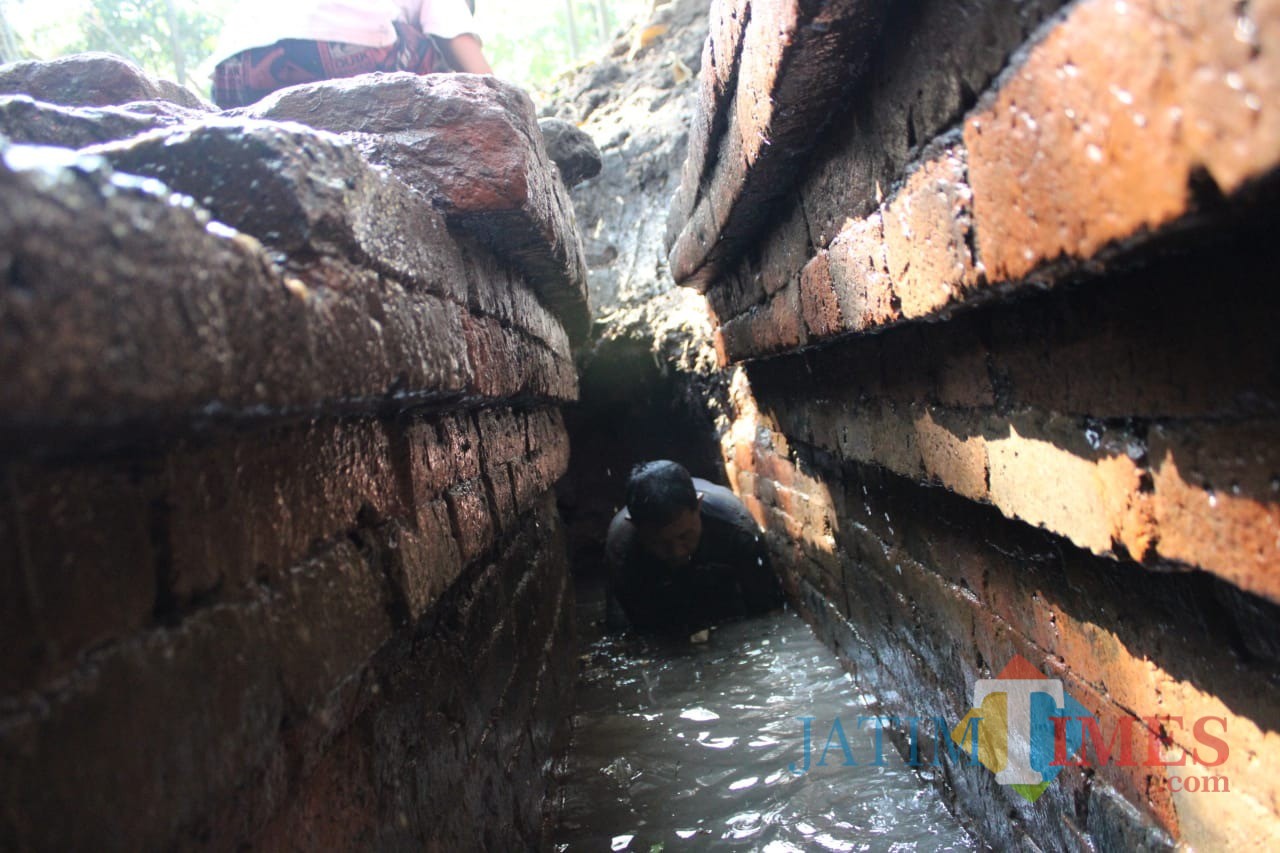 Bangunan purbakala berbentuk kanal kuno atau saluran air yang ditemukan di dasar sendang Dusun Sumberbeji, Desa Kesamben, Kecamatan Ngoro, Kabupaten Jombang, mulai nampak memanjang.